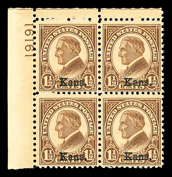 6709 nhbl 659 image1929, 1½¢ Kans. (Scott 659), top left plate block of 4 with plate number 19191, Fresh color that has held up impressively well, o.g., never hinged, Fine to Very Fine.