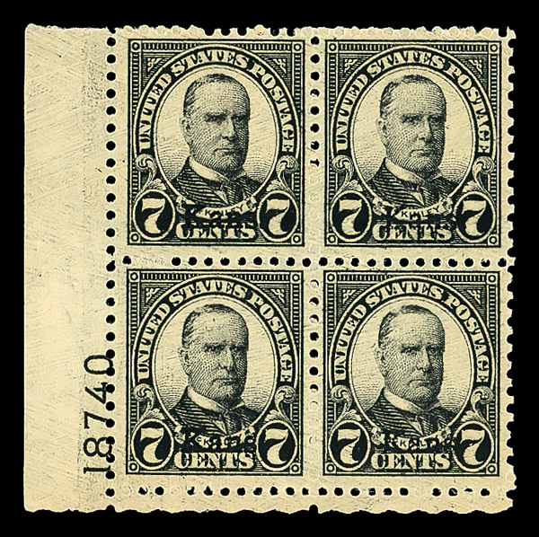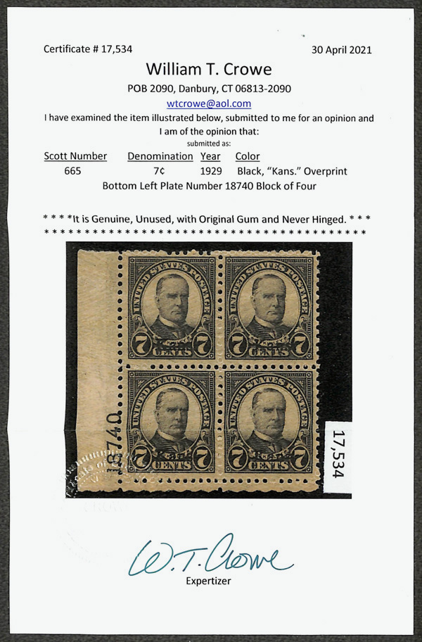 6715 nhbl 665 image1929, 7¢ Kans. (Scott 665), bottom left plate block of 4 with plate number 18740, Strong, fresh hue, o.g., never hinged, Fine to Very Fine, with 2021 Crowe certificate.