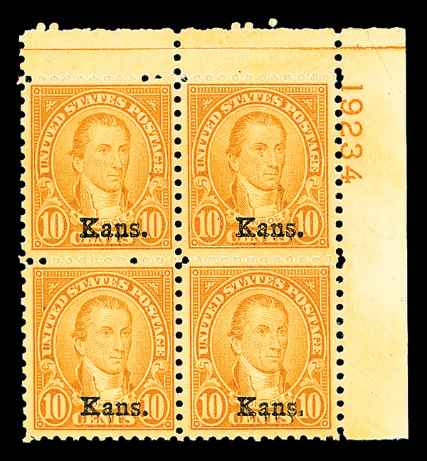 6718 nhbl 668 image1929, 10¢ Kans. (Scott 668), top right plate block of 4 with plate number 19234, Fresh, glowing shading, o.g., never hinged, Fine to Very Fine.