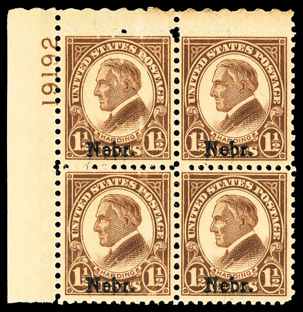 6719 nhbl 670 image1929, 1½¢ Nebr. (Scott 670), top left plate block of 4 with plate number 19192, Fresh and visually bold, o.g., never hinged; ink offset on gum, Fine to Very Fine.