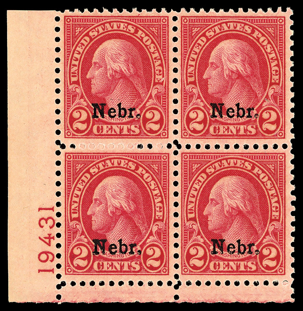 6720 nhbl 671 image1929, 2¢ Nebr. (Scott 671), bottom left plate block of 4 with plate number 19431, Fresh and appealingly vivid, o.g., never hinged; owners handstamp on back of lower left stamp, Very Fine.