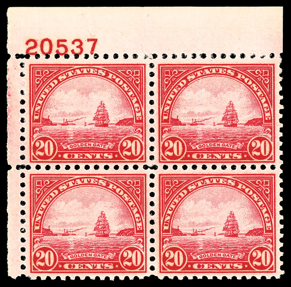 6729 nhbl 698 image1931, 20¢ Golden Gate, rotary press printing (Scott 698), top left plate block of 4 with plate number 20537, Fresh, appealing color on clean paper, o.g., never hinged; small wrinkles on selvage, Fine to Very Fine.