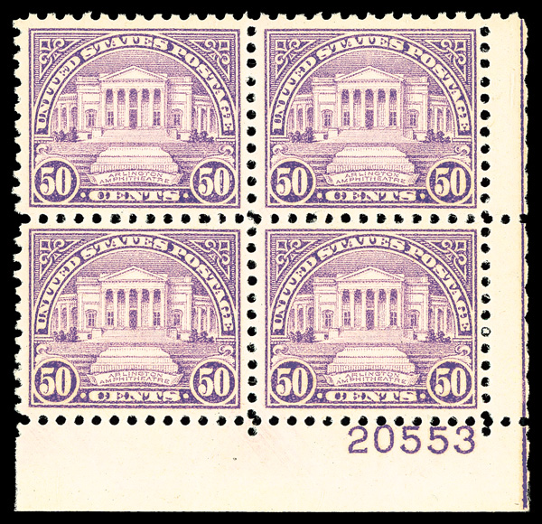6732 nhbl 701 image1931, 50¢ Arlington Amphitheater, rotary press printing (Scott 701), bottom right plate block of 4 with plate number 20553, Freshly vivid appearance overall, o.g., never hinged, Very Fine.