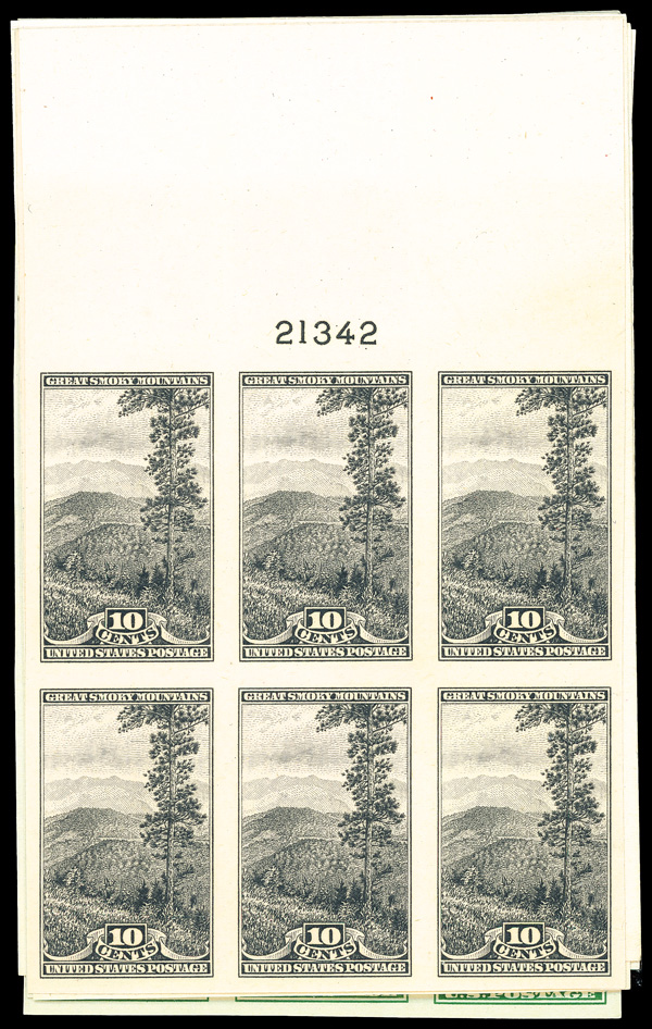 6738 ngbl 756-765 image1935, National Parks, imperf., 1¢ to 10¢ complete (Scott 756-765), set of 10, top margin plate block of 6 set, Clean, vivid freshness that stands out, without gum as issued, Very Fine to Extremely Fine.