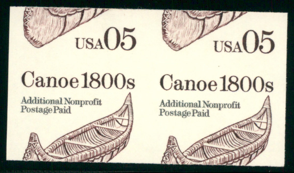 6748 nh 2453a image1991, Transportation Issue, 5¢ Canoe, brown, imperf. pair (Scott 2453a), major horizontal miscut, o.g., never hinged, Very Fine.