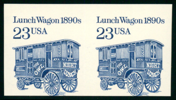 6749 nh 2464b image1991, Transportation Issue, 23¢ Lunch Wagon, prephosphored coated paper, imperf. pair (Scott 2464b), o.g., never hinged, Fine.