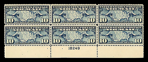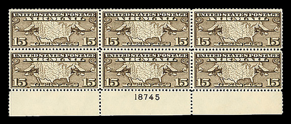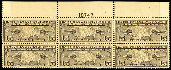 6759 nhbl C8 imageAirmail, 1926, 15¢ Map & Planes (Scott C8), top margin plate block of 6 with plate number 18747, Fresh, consistent color, o.g., never hinged, Fine to Very Fine.