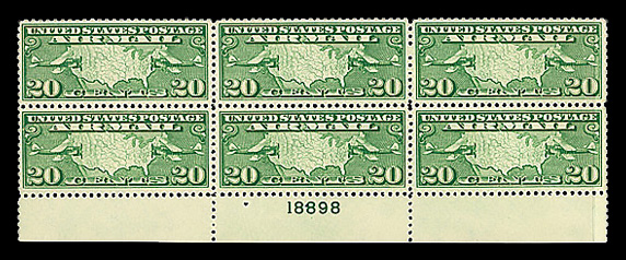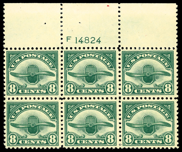 6756 nhbl C4 imageAirmail, 1923, 8¢ dark green (Scott C4), top margin plate block of 6 with plate number F 14824, Balanced color strength, o.g., never hinged, Fine to Very Fine.
