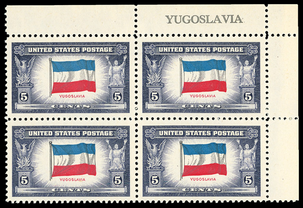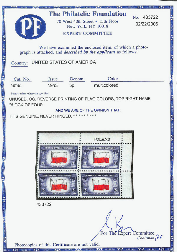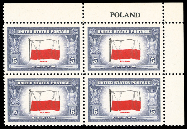 6742 nhbl 909c image1943, 5¢ Overrun Countries: Poland, reverse printing of flag colors (Scott 909c), name block of 4, Clean, bright ink, o.g., never hinged, Very Fine, with 2006 P.F. certificate.