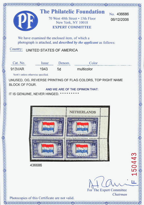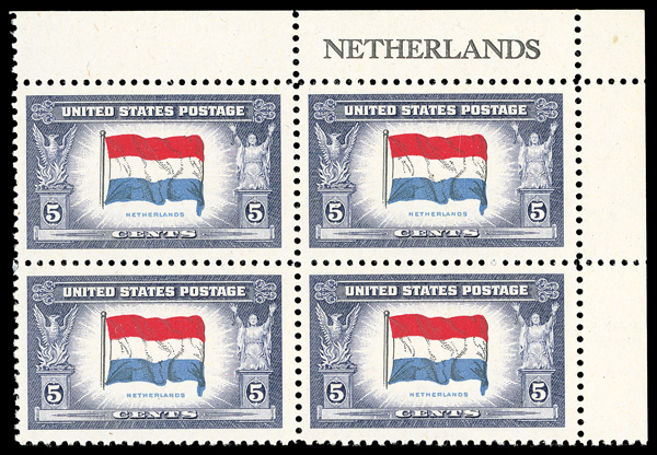 6743 nhbl 913 image1943, 5¢ Overrun Countries: Netherlands, reverse printing of flag colors (Scott 913a), name block of 4, Well-preserved color tones, o.g., never hinged, Very Fine, with 2006 P.F. certificate. (Image) (Image2) (All Images)