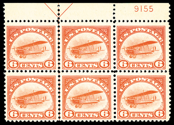 6752 nhbl C1 imageAirmail, 1918, 6¢ orange (Scott C1), top margin plate block of 6 with plate number 9155, Clean, sharp appearance, o.g., never hinged, Fine.