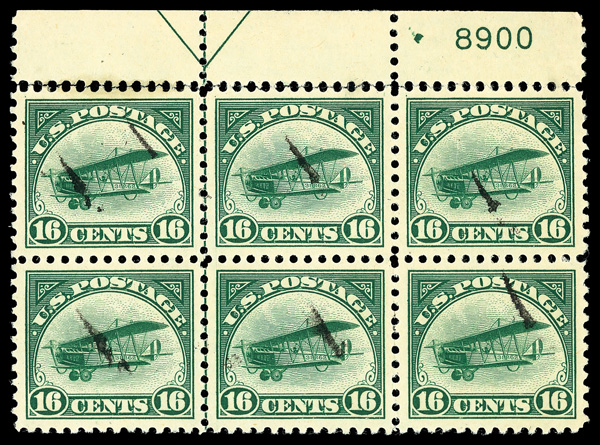 6754 Obl C2 imageAirmail, 1918, 16¢ green (Scott C2), top margin plate block of 6 with plate number F 8900, exceptionally rare as a complete used plate block; large perf separation between selvage and top stamps, Fine to Very Fine. (Image) Suggested Bid $300