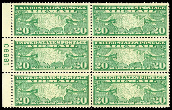 6760 nhbl C9 imageAirmail, 1927, 20¢ Map & Planes (Scott C9), left margin plate block of 6 with plate number 18890, Bright, clear impression, o.g., never hinged, Very Fine.