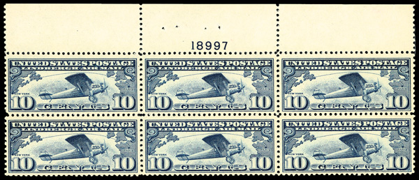 6761 nhbl C10 imageAirmail, 1927, 10¢ Lindbergh (Scott C10), top margin plate block of 6 with plate number 18997, Clean color balance, o.g., never hinged, Very Fine.