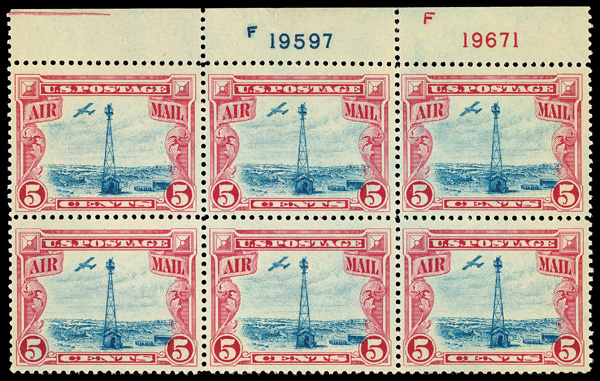 6762 nhbl C11 imageAirmail, 1928, 5¢ Beacon (Scott C11), top margin plate block of 6 with plate numbers F 19597 and F 19671, Clean, sharp appearance, scarce plate block with no "Top", o.g., never hinged, Fine to Very Fine.