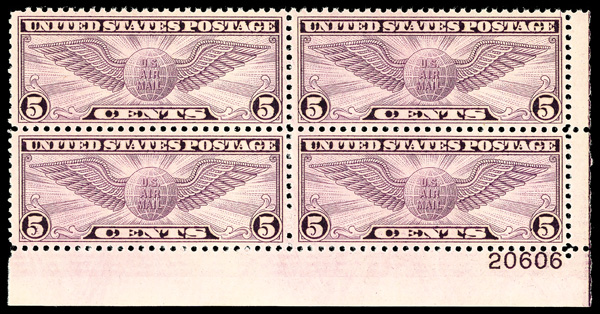 6763 nhbl C16 imageAirmail, 1931, 5¢ Winged Globe, rotary press printing (Scott C16), bottom right plate block of 4 with plate number 20606, Clean, crisp color, o.g., never hinged, Fine to Very Fine.