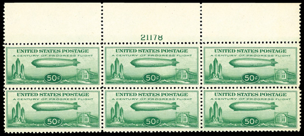 6764 nhbl C18 imageAirmail, 1933, 50¢ "Chicago" Zeppelin (Scott C18), top margin plate block of 6 with plate number 21178, Clean, vibrant appearance, o.g., never hinged; tiny gum skips, Fine to Very Fine.