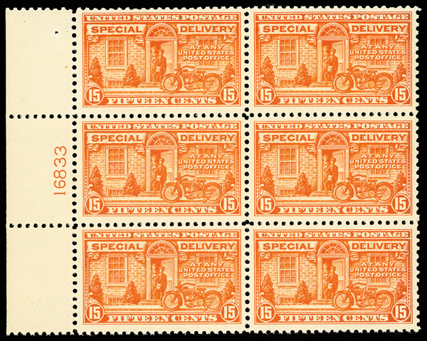 6769 nhbl E13 imageSpecial Delivery, 1925, 15¢ deep orange (Scott E13), left margin plate block of 6 with plate number 16833, Fresh with strong color, o.g., never hinged, Fine to Very Fine.