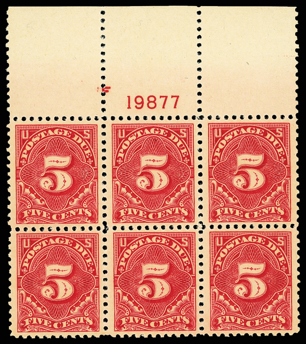 6778 nhbl J64 imagePostage Due, 1917, 5¢ carmine, unwatermarked, perf. 11 (Scott J64), top margin plate block of 6 with plate number F 19877, Fresh and appealing overall, o.g., never hinged, Very Fine.