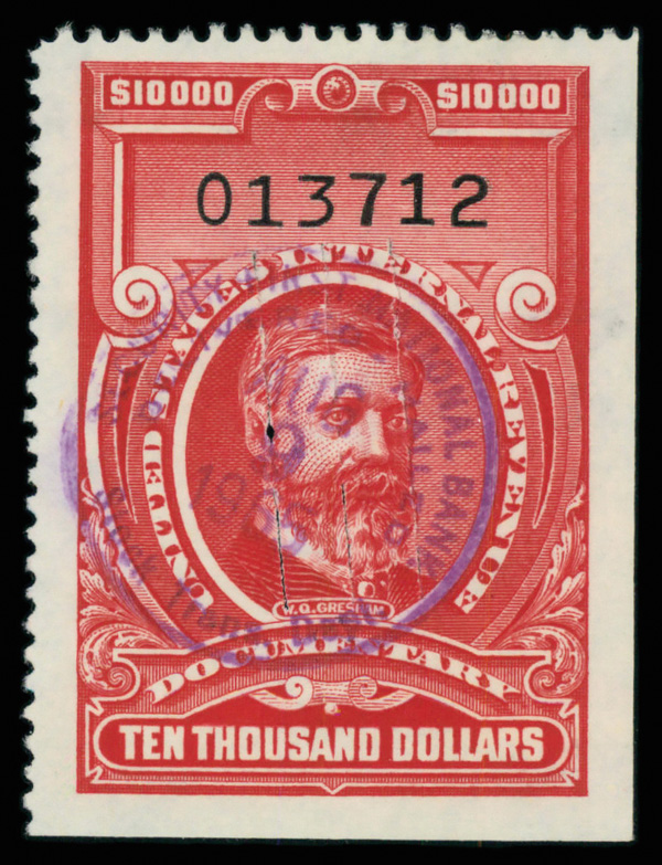 6823 O R732 imageDocumentary, 1958, $10,000 Gresham (Scott R732), cut cancel, Extremely Fine to Superb.