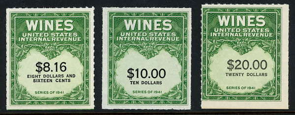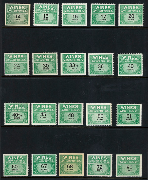 6827 ng RE108//RE203 imageWine Stamps, 1942-54, 1/5¢-$20.00 (Scott RE108//RE203), selection of 59 different, without gum as issued, Fine to Very Fine.