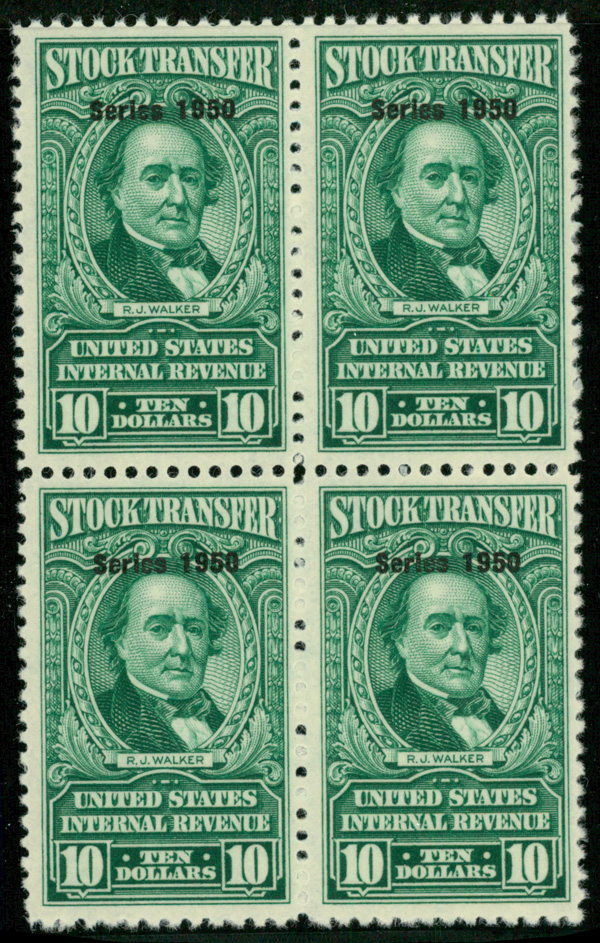 6824 ngbl RD328 imageStock Transfer, 1950, $10 Walker (Scott RD328), block of 4, unused without gum, Very Fine.