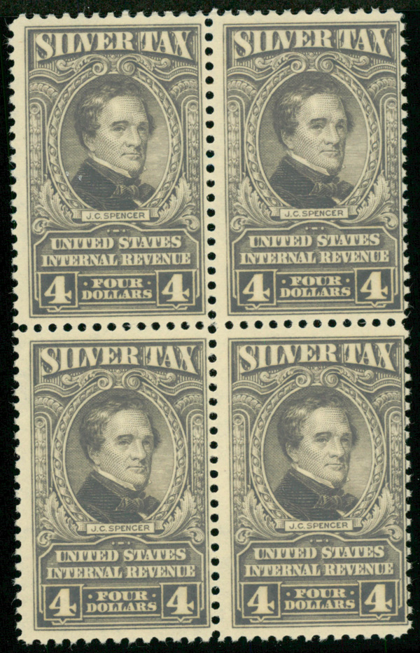 6828 nhbl RG123 imageSilver Tax, 1944, $4 gray (Scott RG123), block of 4, o.g., never hinged, Fine.