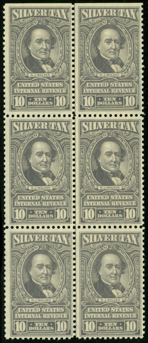 6830 nhbl RG125 imageSilver Tax, 1944, $10 gray (Scott RG125), top margin straight edge block of 6, o.g., never hinged (gum skips), Fine to Very Fine.