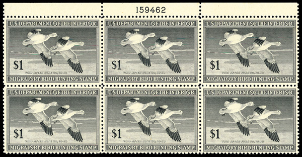 6836 nhbl RW14 imageFederal Duck Stamp, 1947, $1 Snow Geese (Scott RW14), top margin plate number 159462 block of 6, o.g., never hinged, fresh and sound with clean impression and like-new paper, Very Fine.