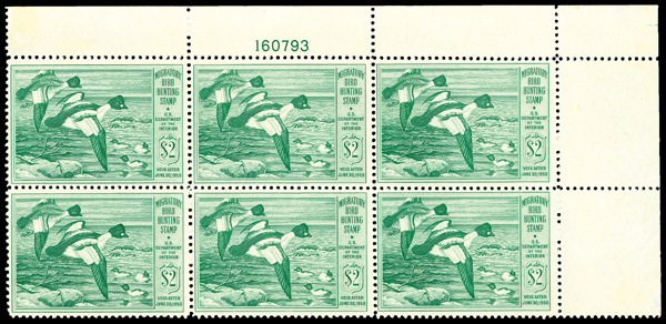 6838 nhbl RW16 imageFederal Duck Stamp, 1949, $2 Goldeneye Ducks (Scott RW16), top right plate number 160793 block of 6, o.g., never hinged, wonderfully fresh with eye-popping color; couple light usual gum bends, Fine to Very Fine.