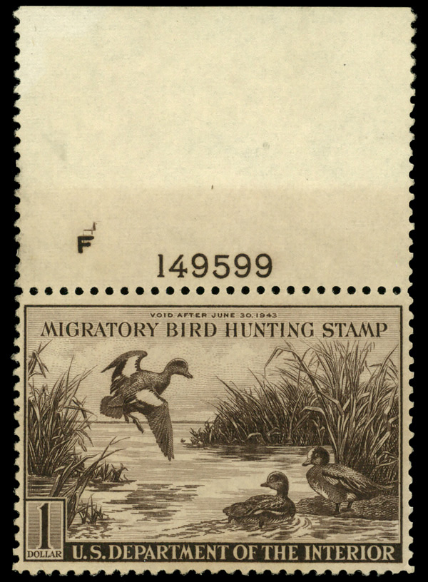 6834 nh RW9 imageFederal Duck Stamp, 1942, $1 Baldpates (Scott RW9), plate number single, o.g., never hinged, Fine.