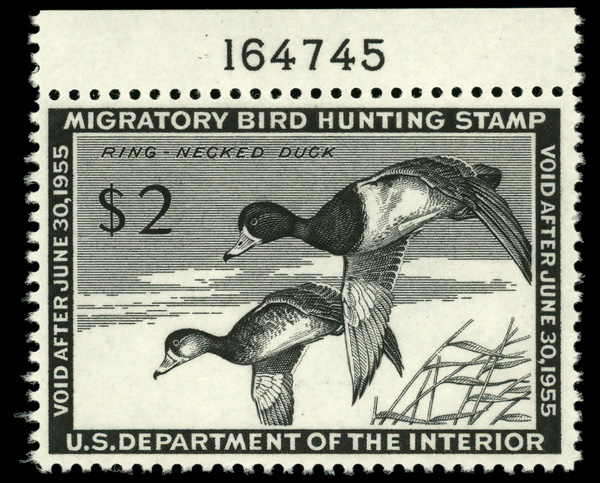 6839 nh RW21 imageFederal Duck Stamp, 1954, $2 Ring-necked Ducks (Scott RW21), plate number single, o.g., never hinged, Very Fine.