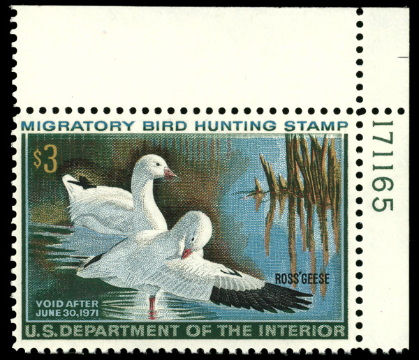 6855 nh RW37 imageFederal Duck Stamp, 1970, $3 Ross's Geese (Scott RW37), plate number single, o.g., never hinged, Very Fine.