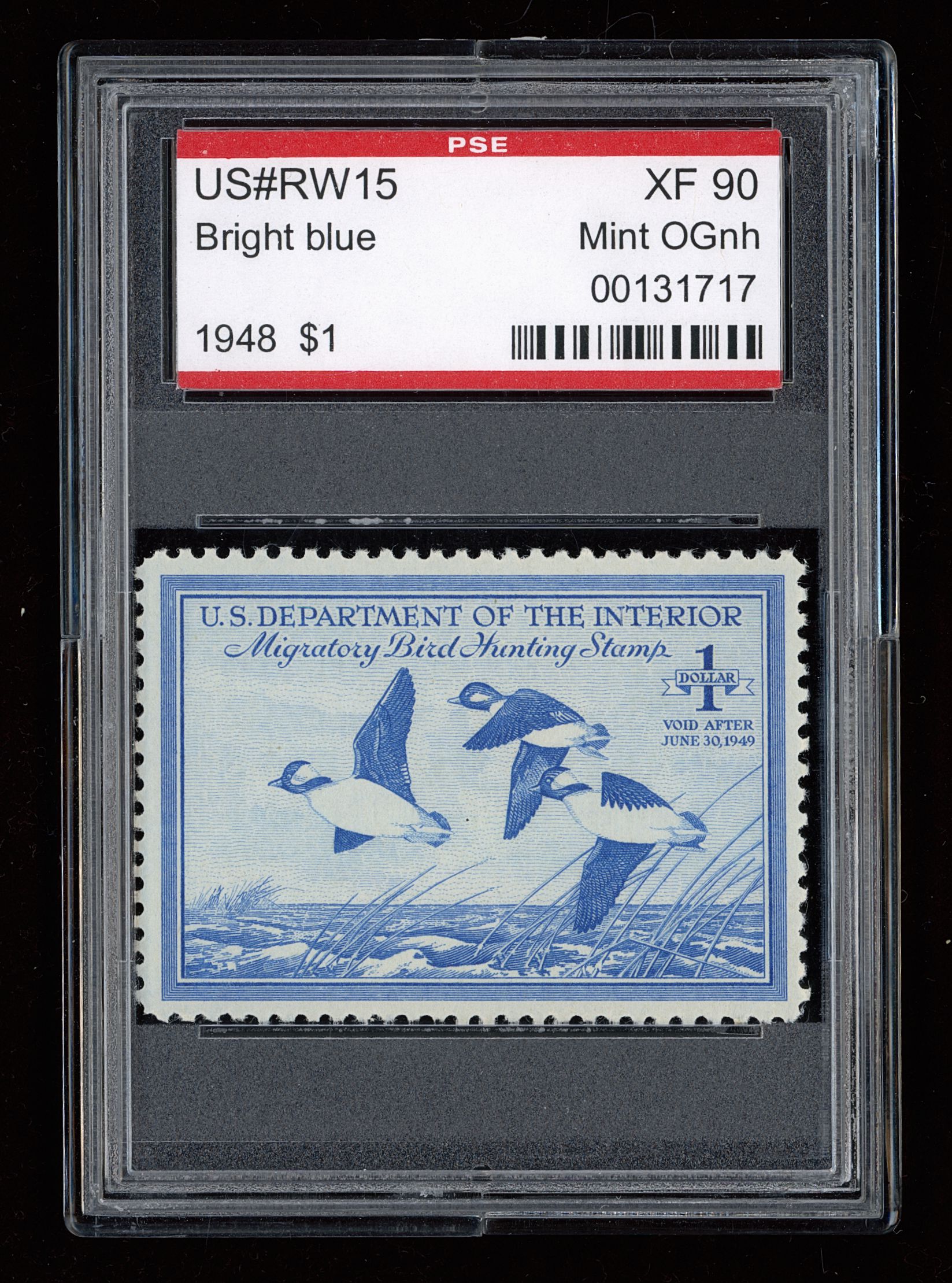 6837 nh RW15 imageFederal Duck Stamp, 1948, $1 Buffleheads (Scott RW15), o.g., never hinged, Extremely Fine, with P.S.E. encapsulated certificate graded XF 90.