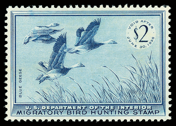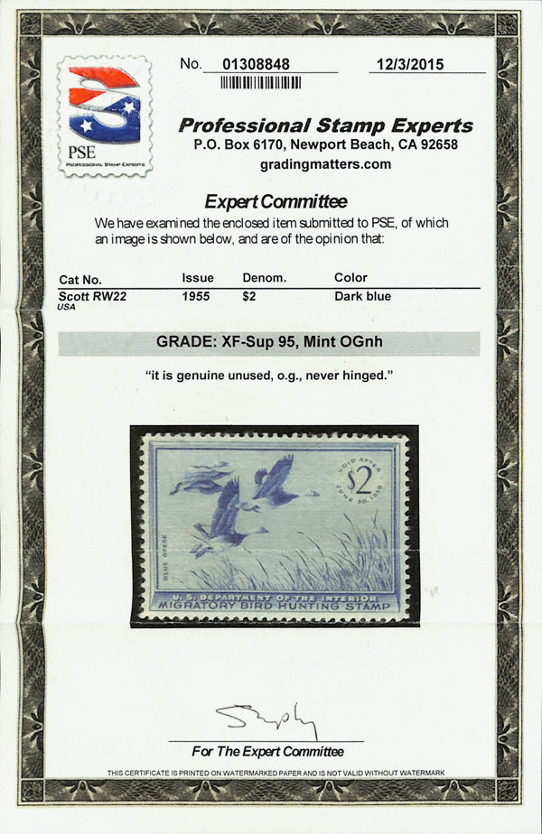 6840 nh RW22 imageFederal Duck Stamp, 1955, $2 Blue Geese (Scott RW22), o.g., never hinged, Extremely Fine to Superb, with 2015 P.S.E. certificate graded XF-SUP 95.
