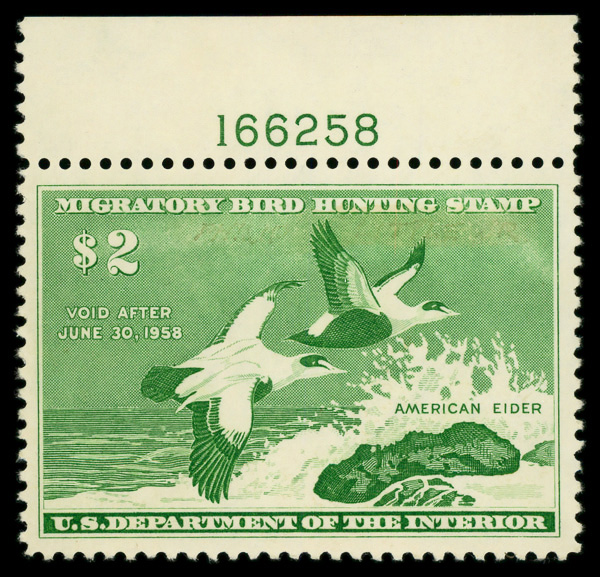 6842 nh RW24 imageFederal Duck Stamp, 1957, $2 American Eider (Scott RW24), plate number single, o.g., never hinged, Extremely Fine.