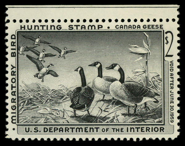 6843 nh RW25 imageFederal Duck Stamp, 1958, $2 Canada Geese (Scott RW25), o.g., never hinged, Extremely Fine.