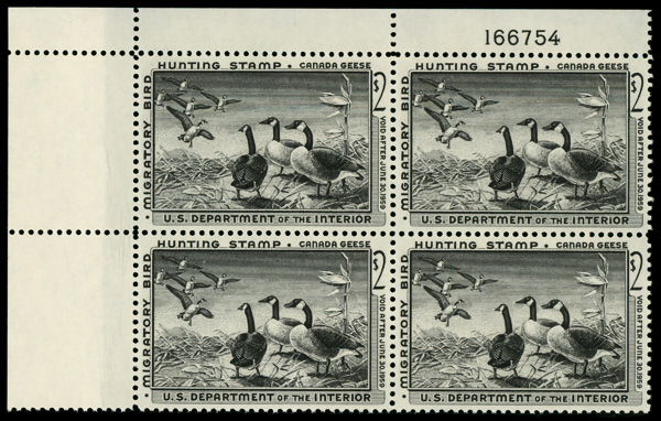 6844 nhbl RW25 imageFederal Duck Stamp, 1958, $2 Canada Geese (Scott RW25), plate block of 4, o.g., never hinged, Extremely Fine to Superb.