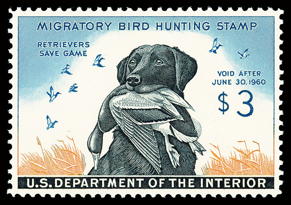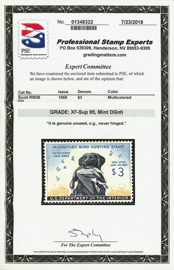 6845 nh RW26 imageFederal Duck Stamp, 1959, $3 Labrador Retriever (Scott RW26), o.g., never hinged, Extremely Fine to Superb, with 2018 P.S.E. certificate graded XF-SUP 95.