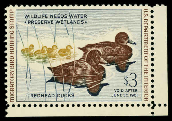 6846 nh RW27 imageFederal Duck Stamp, 1960, $3 Redhead Ducks (Scott RW27), o.g., never hinged, Superb.