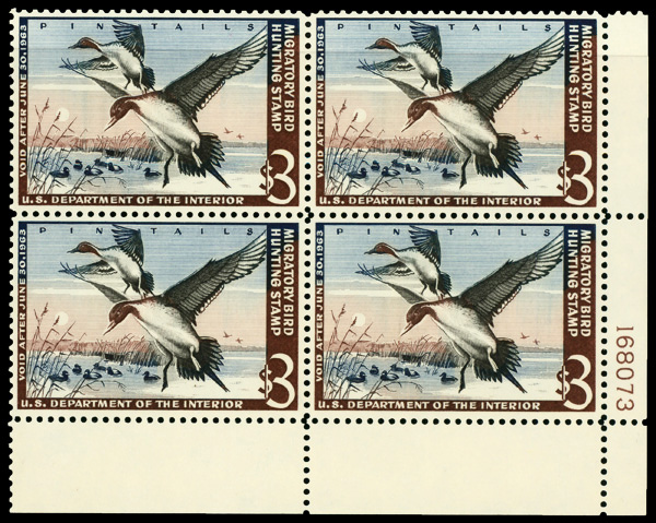6849 nhbl RW29 imageFederal Duck Stamp, 1962, $3 Pintail Drakes (Scott RW29), plate block of 4, o.g., never hinged, Extremely Fine.