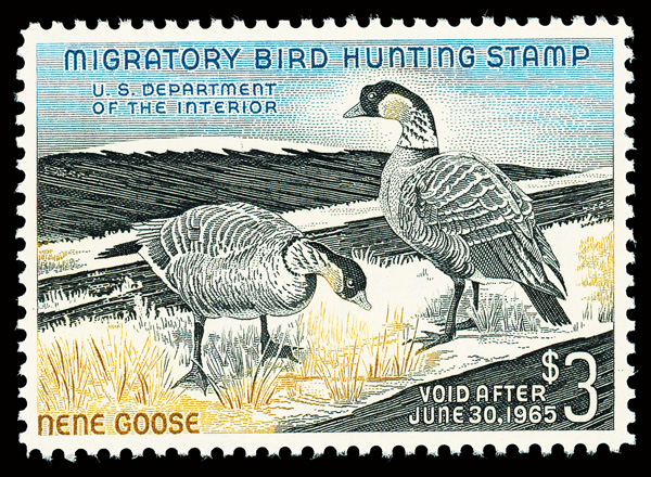 6851 nh RW31 imageFederal Duck Stamp, 1964, $3 Nene Geese (Scott RW31), o.g., never hinged, Very Fine to Extremely Fine, with 2006 P.S.E. certificate graded XF-SUP 95.