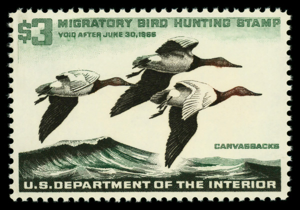 6853 nh RW32 imageFederal Duck Stamp, 1965, $3 Canvasback Drakes (Scott RW32), o.g., never hinged, Extremely Fine.