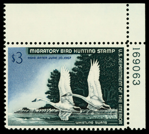 6854 nh RW33 imageFederal Duck Stamp, 1966, $3 Whistling Swans (Scott RW33), plate number single, o.g., never hinged, Very Fine to Extremely Fine.