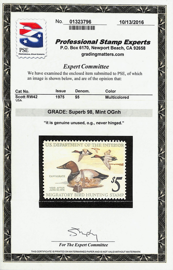 6859 nh RW42 imageFederal Duck Stamp, 1975, $5 Canvasbacks (Scott RW42), o.g., never hinged, Superb, with 2016 P.S.E. certificate graded SUP 98.