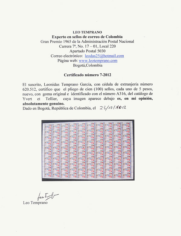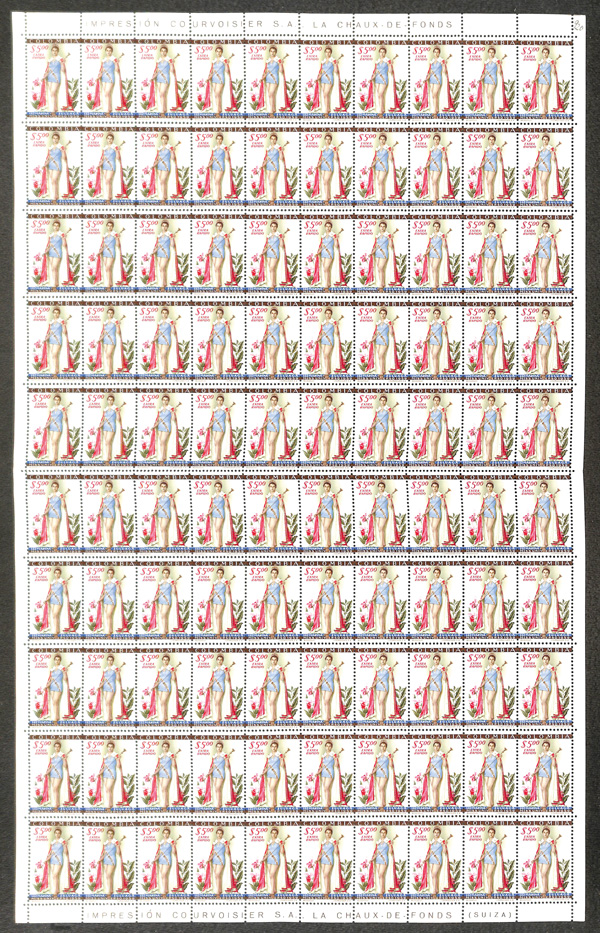 9727 nhbl C318 image1959, 5p Miss Universe Air Post (Scott C318), complete sheet of 100, o.g., never hinged, bright colors on radiant white paper; folded along center row of horizontal perfs, still an Extremely Fine and valuable sheet, signed Temprano on bottom left stamp, with 2012 Temprano certificate.