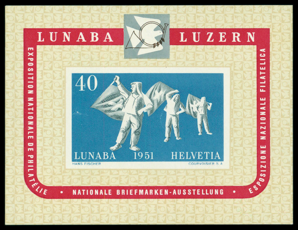 9944 nhbl 352a image1955, Lausanne Philatelic Exhibition souvenir sheet (Scott 352a), souvenir sheet of 2, o.g., never hinged, Fine to Very Fine.