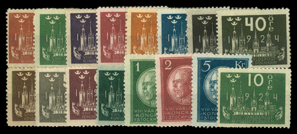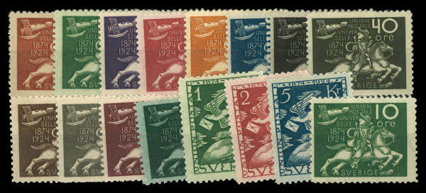 9934 nh 248-262 image1936 Swedish Postal Service complete (Scott 248-262), complete set of singles, o.g., never hinged, Fine to Very Fine.