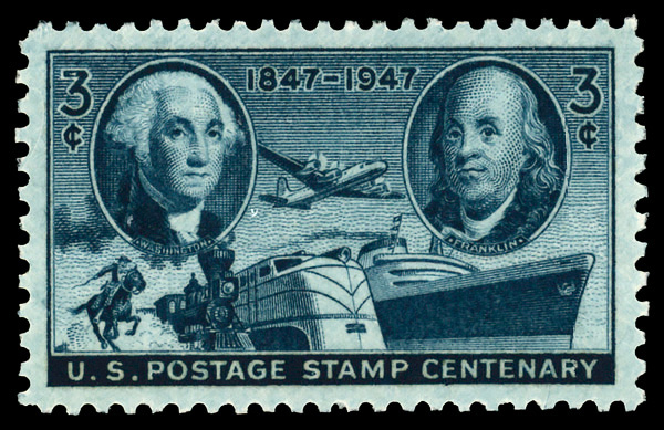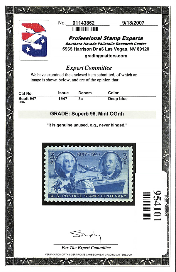9197 nh 947 image1947, 3¢ Postage Stamp Centenary (Scott 947), o.g., never hinged, Superb, with 2007 P.S.E. certificate graded SUP 98.