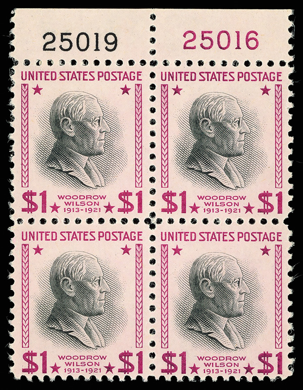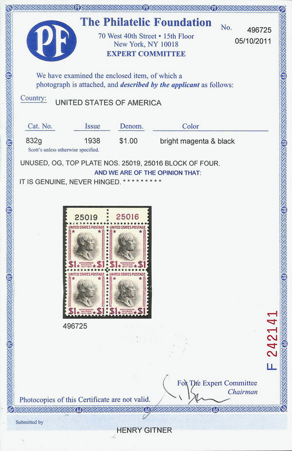 9194 nhbl 832g image1954, Presidential Issue, $1 Wilson, bright magenta & black (Scott 832g), top margin plate block of 4, Gorgeous brilliant tone, o.g., never hinged, Very Fine, with 2011 P.F. certificate.